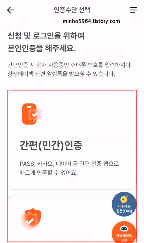 '간편(민간)인증' 또는 '공동인증서 인증' 중 1택하여
